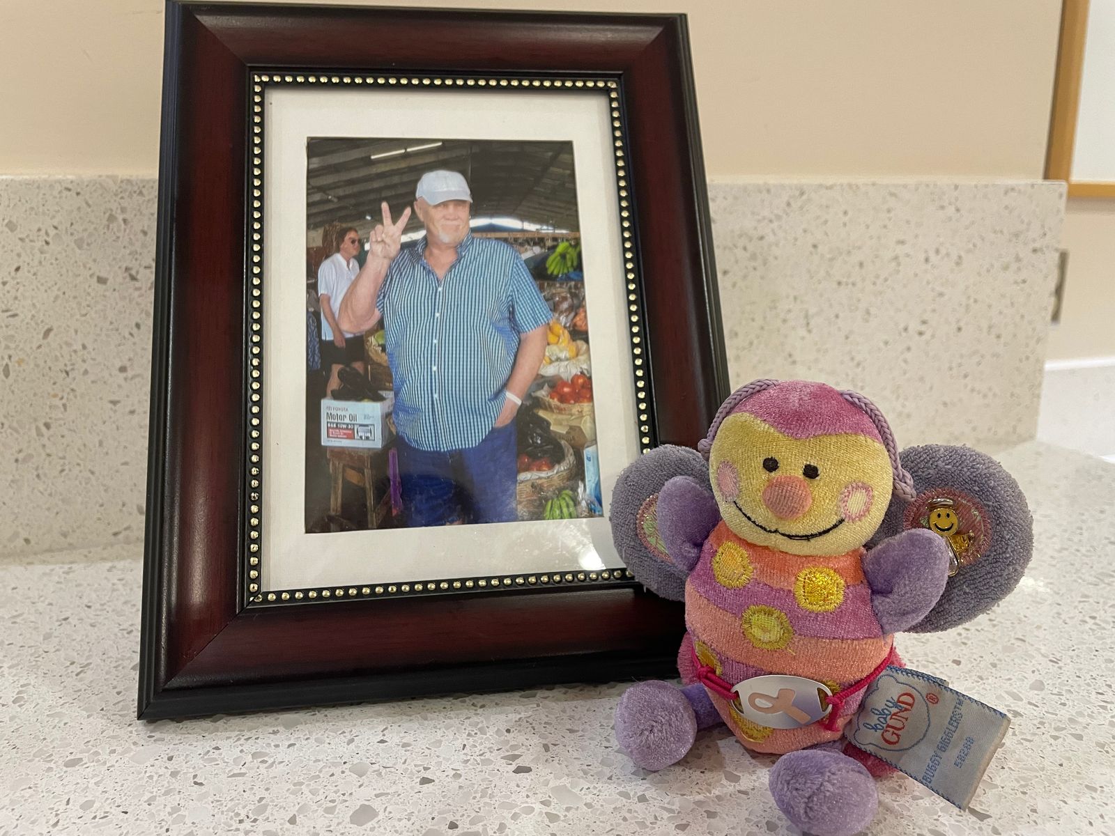 “We went to New Brunswick for the first time, and went into the store, and there were all kinds of funny stuff there, including this little stuffed bee who laughs. I didn’t want to buy it because it was $20, but Danny bought it for me anyway, so this is Tykleb (Tickle Bee),” she says with a smile. “Tykleb goes everywhere with us on holiday. He always used to say, ‘Do you have Tykleb with you?’ Of course I did. We have photos of her on the beach, I have her under Niagara Falls, Tykleb is everywhere.”